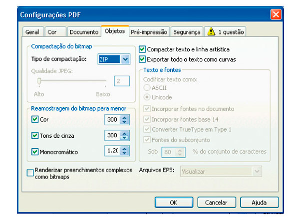 Na aba "Objetos" em "Compactação do bitmap" deixe a opção "ZIP", altere os valores e marque as opções como na figura ao lado.